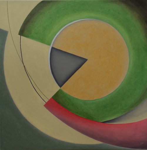 The cheese and the cut are rendered in a panoply of colors, creating a visual spectacle that draws the viewer's eye. Shades of green are especially prominent, dominating both the foreground and background and lending the work a sense of unity and cohesion with its name. The painting is not just a simple geometric study; despite its abstract nature, the piece is visually engaging, with the interplay of shapes and colors creating a dynamic visual rhythm. It allows the viewer to focus entirely on the interplay of geometric forms and color.